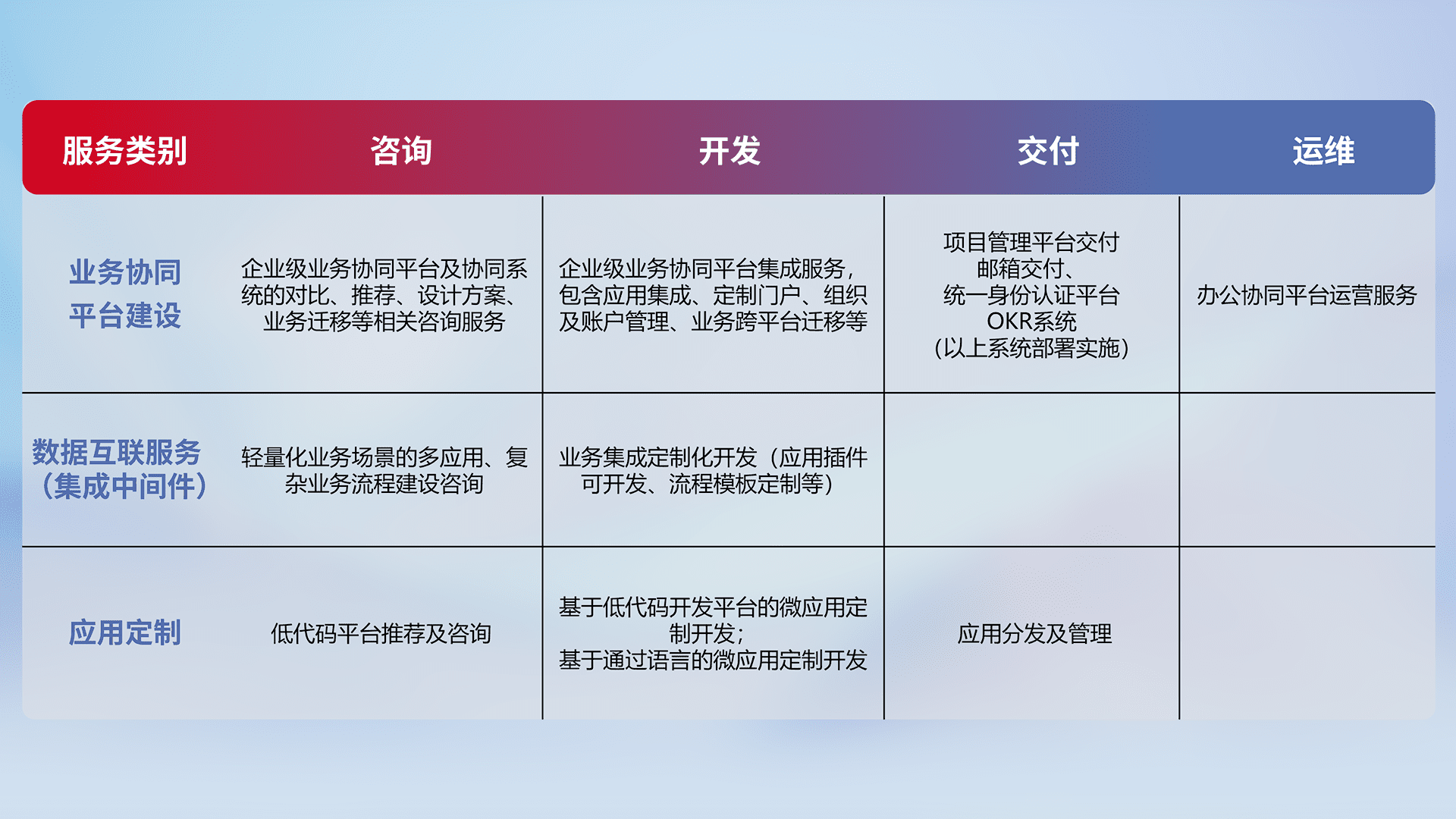 针对钉钉、、、企微、、、、IDaas等平台级产品提供产品的规划、、、方案、、、、交付、、、、定制化开发等服务,,实现如统一协同办公、、、、智能客户服务、、、、混合会议管理、、、智能数据查询、、、、等业务场景,,实现数字化转型。。