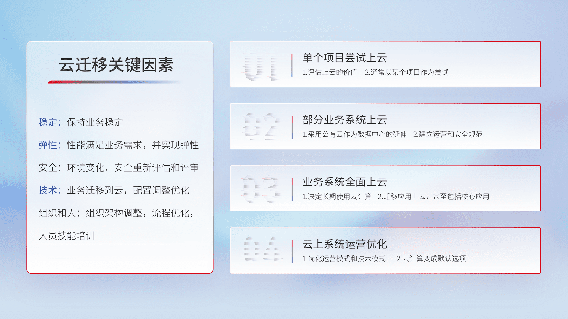 结合实际业务,,,,从规划设计、、、、云平台选型、、云原生改造、、、、数据迁移、、、集成交付,,迁移全过程为客户识别最佳上云路径,,,做好风险识别管理,,,,设计网络架构、、身份权限、、、、安全审计合规、、、操作审计、、、、日志审计、、、、监控告警策略、、、、多站点容灾设计等,,,对云上基础设施进行整体规划,,提升IT治理水平,,,以满足弹性、、高可用、、、、高性能的需求。。。