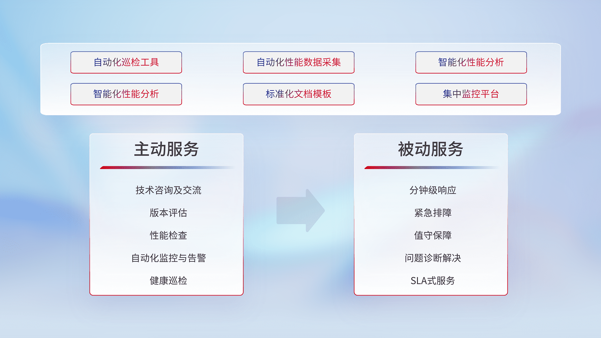 智能化工具和标准化文档,,,,保障服务质量,,,,提供主动服务(包含技术咨询、、版本评估、、、、性能检查、、、自动化监控与告警、、健康巡检)和被动服务包含(分钟级响应、、、、紧急排障、、值守保障、、、、问题诊断解决、、、、SLA服务)。。